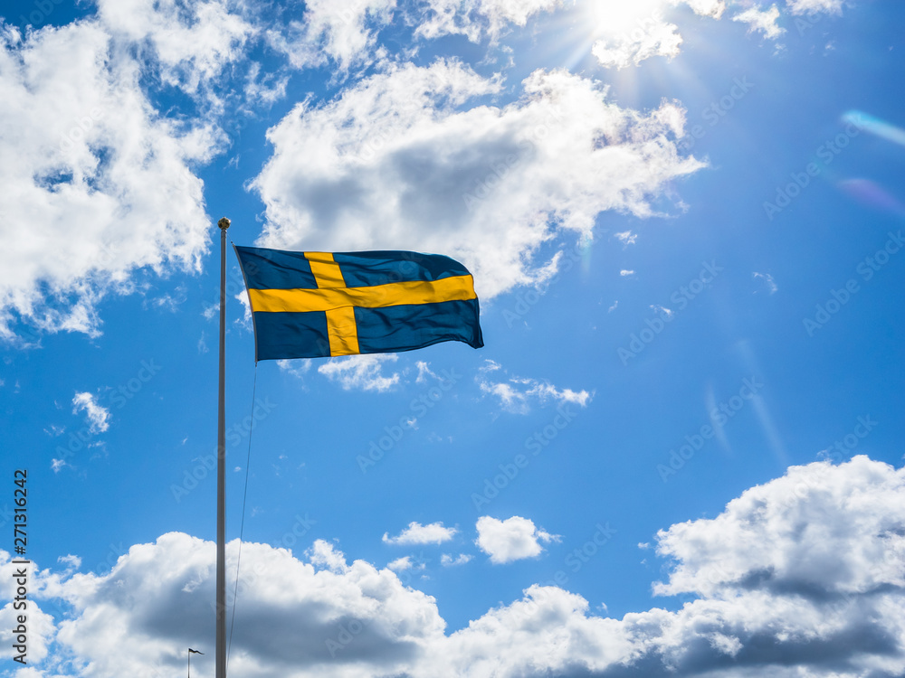 Swedish Flag On Blue Sky White Clouds Swedish Flag Day Concept Sveriges Nationaldag National Day Of Sweden Swedish Flag Day Stock Foto Adobe Stock